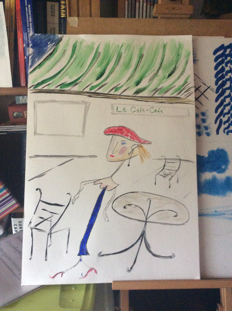 Moving quickly, I grabbed a partially used sheet of art paper with some old doodles on one side, turned it over and, for no particular reason, quickly sketched a street scene outside a Paris Café.